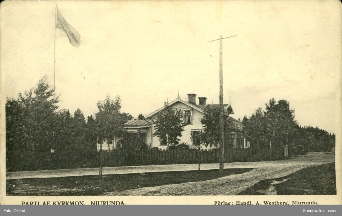Vykort med motiv över parti av Kyrkomon i Njurunda utanför Sundsvall.