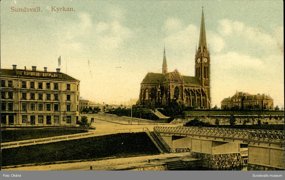 Vykort med motiv över Gustav Adolfs kyrka i Sundsvall.