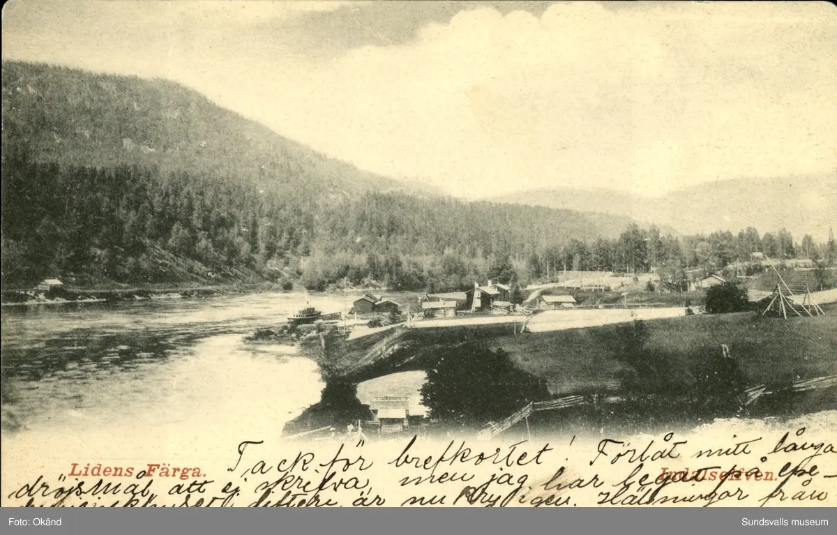 Vykort med motiv över Lidenfärja som trafikerade Indalsälven.