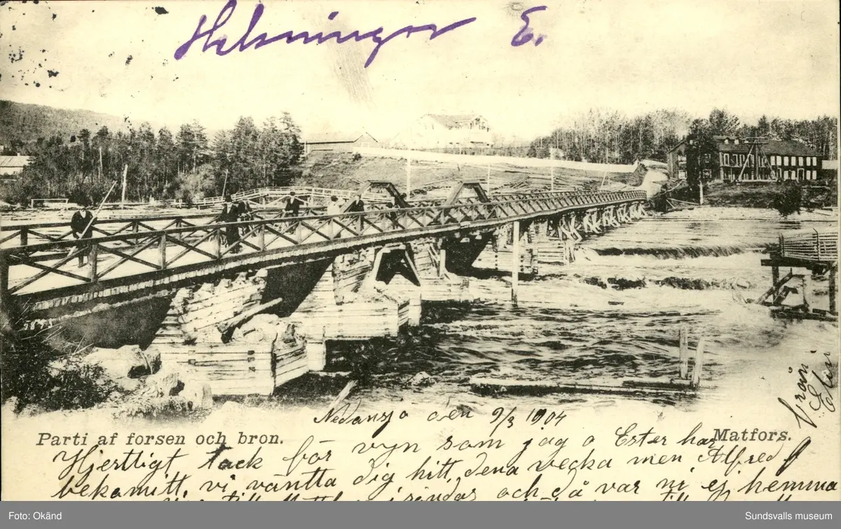Vykort med motiv av forsen och bron över Ljungan i Matfors.
