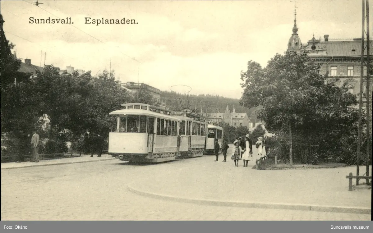 Vykort över en spårvagn på Esplanaden i Sundsvall.