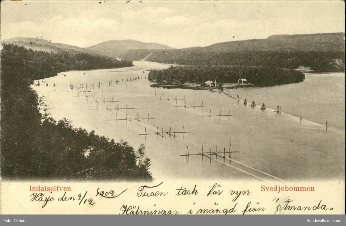 Vykort med motiv över Svedjebommen i Indalsälven.