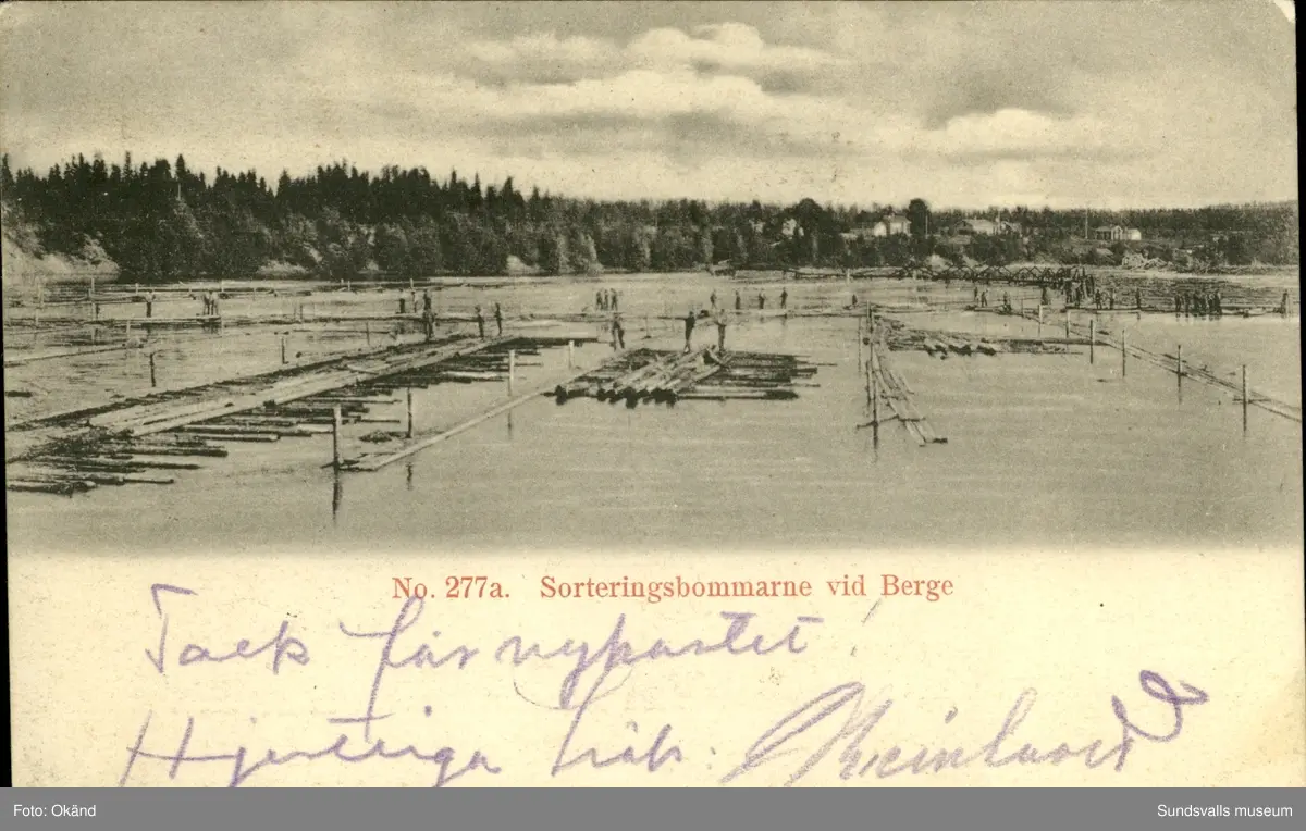 Vykort med motiv över sorteringsbommarna vid Berge i Indalsälven.