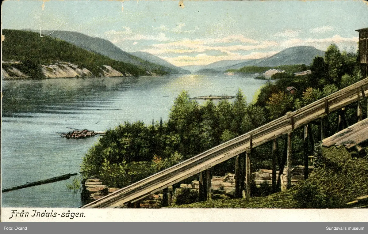 Vykort med motiv över Indalsälven och Indalssågen.