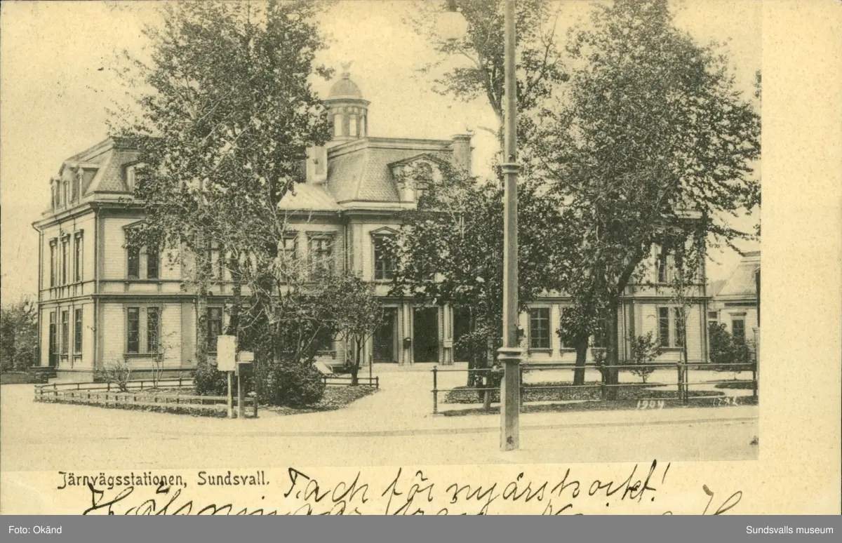 Vykort med motiv över järnvägsstationen i Sundsvall.