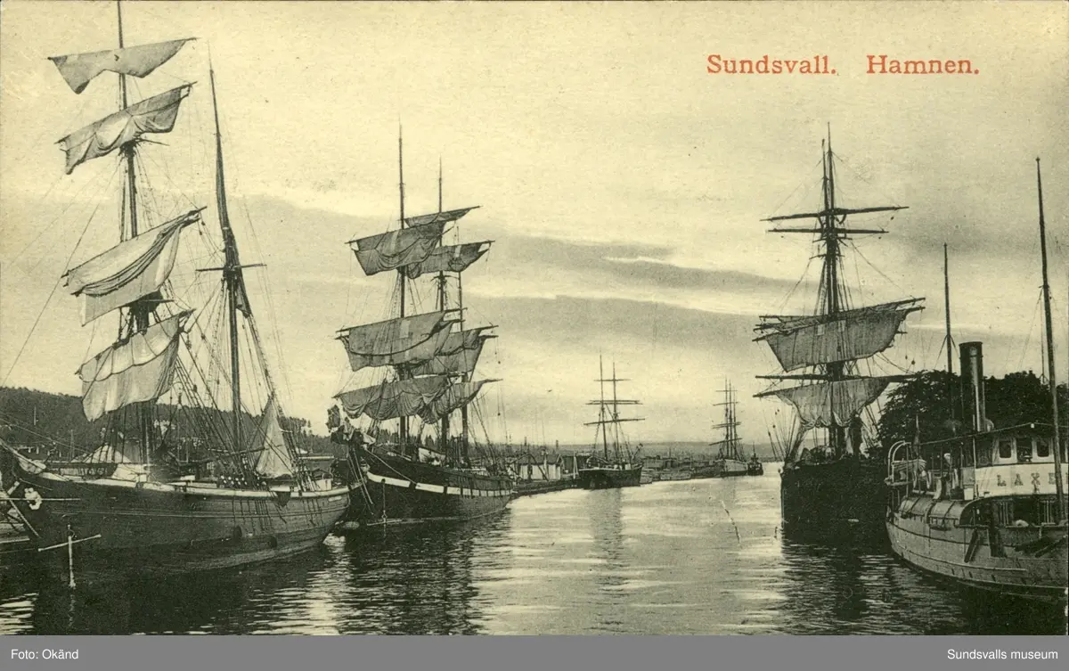 Vykort över norra hamnen i Sundsvall med båten Laxen i förgrunden.