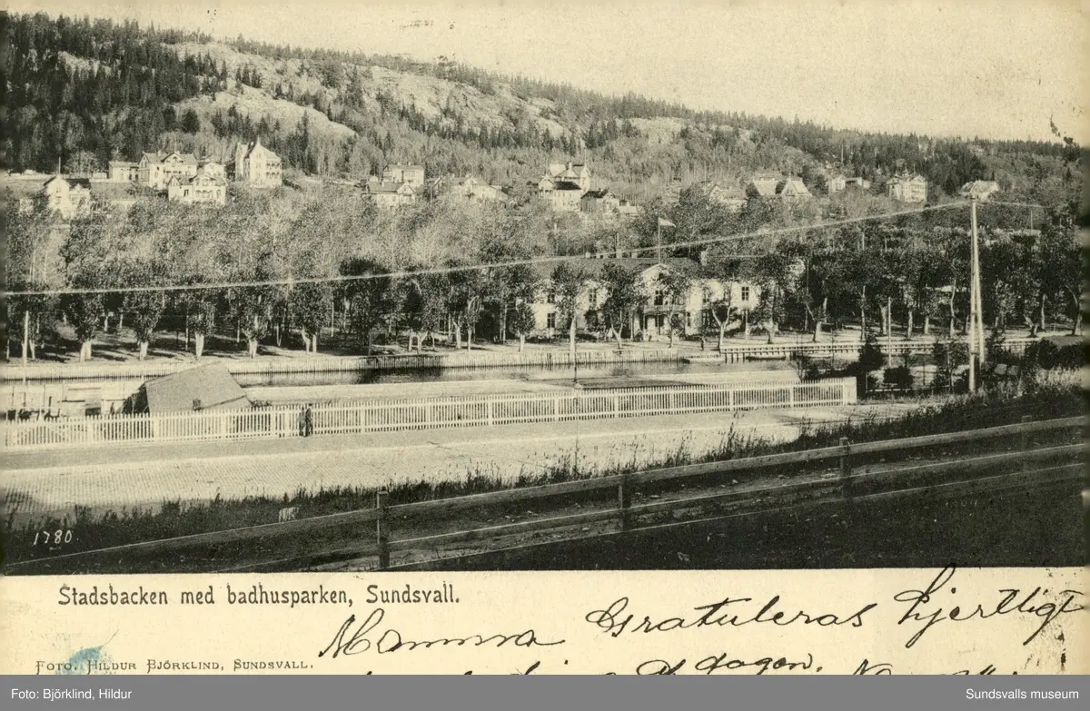 Vykort med motiv över Stadsbacken med Badhusparken i Sundsvall.