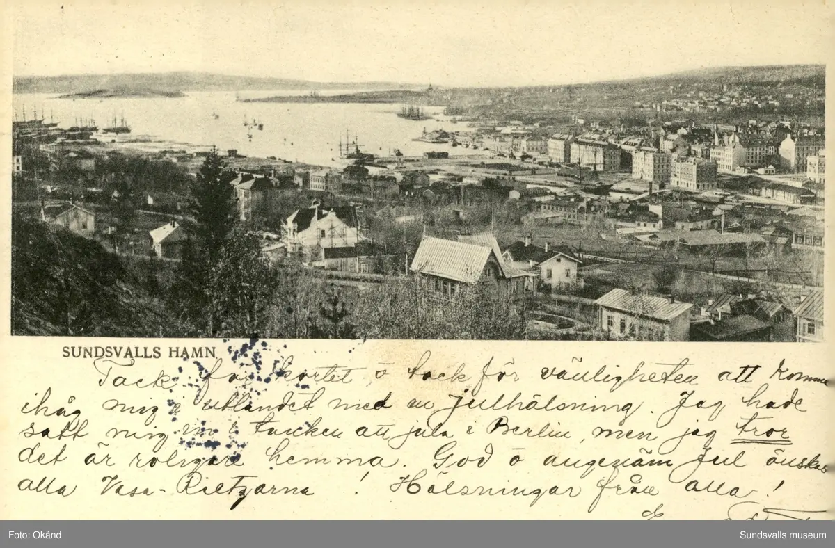 Titel: Vykort med motiv över hamnen i Sundsvall.