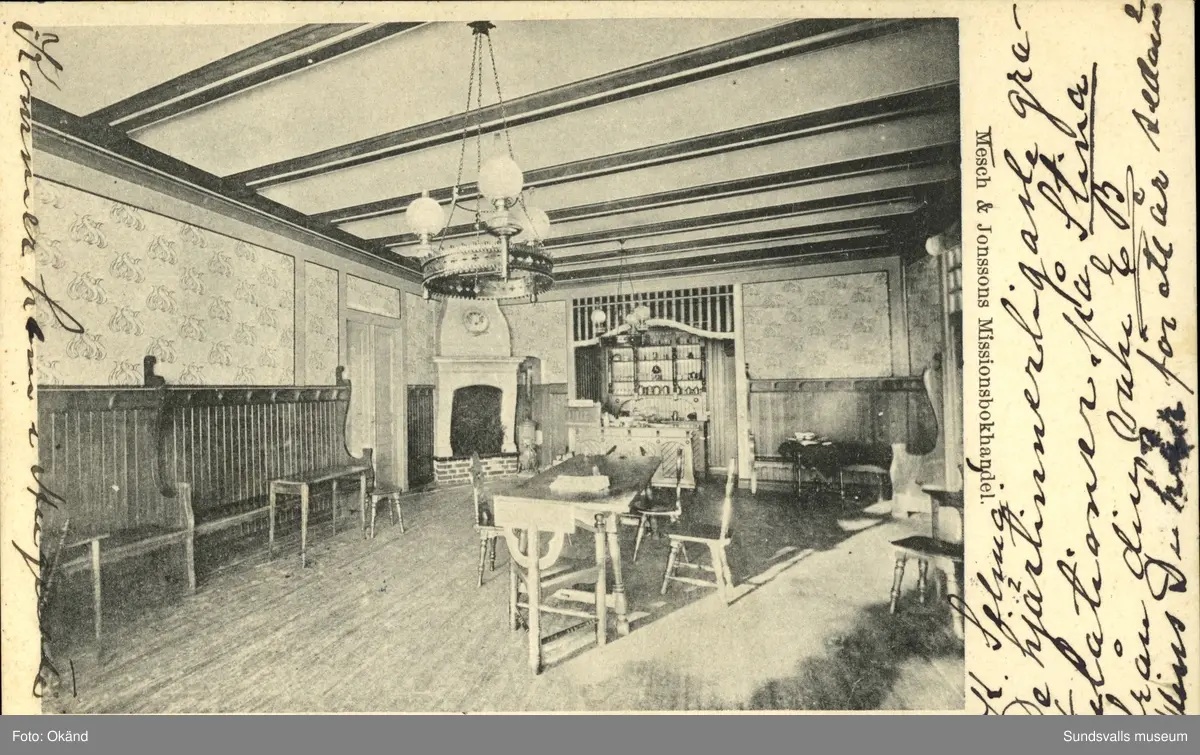 Vykort med motiv över interiören i Turistpaviljongen i Sundsvall.