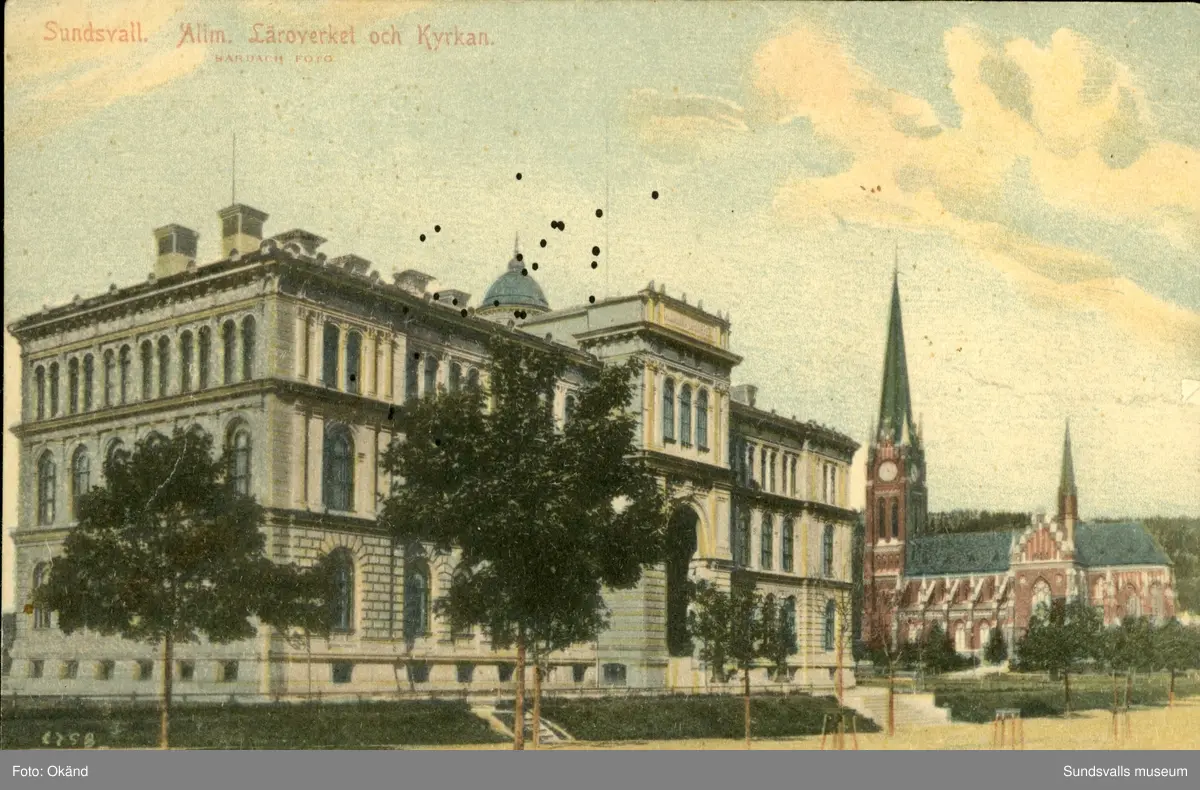 Vykort med motiv över kyrkan och Allmänna läroverket i Sundsvall.