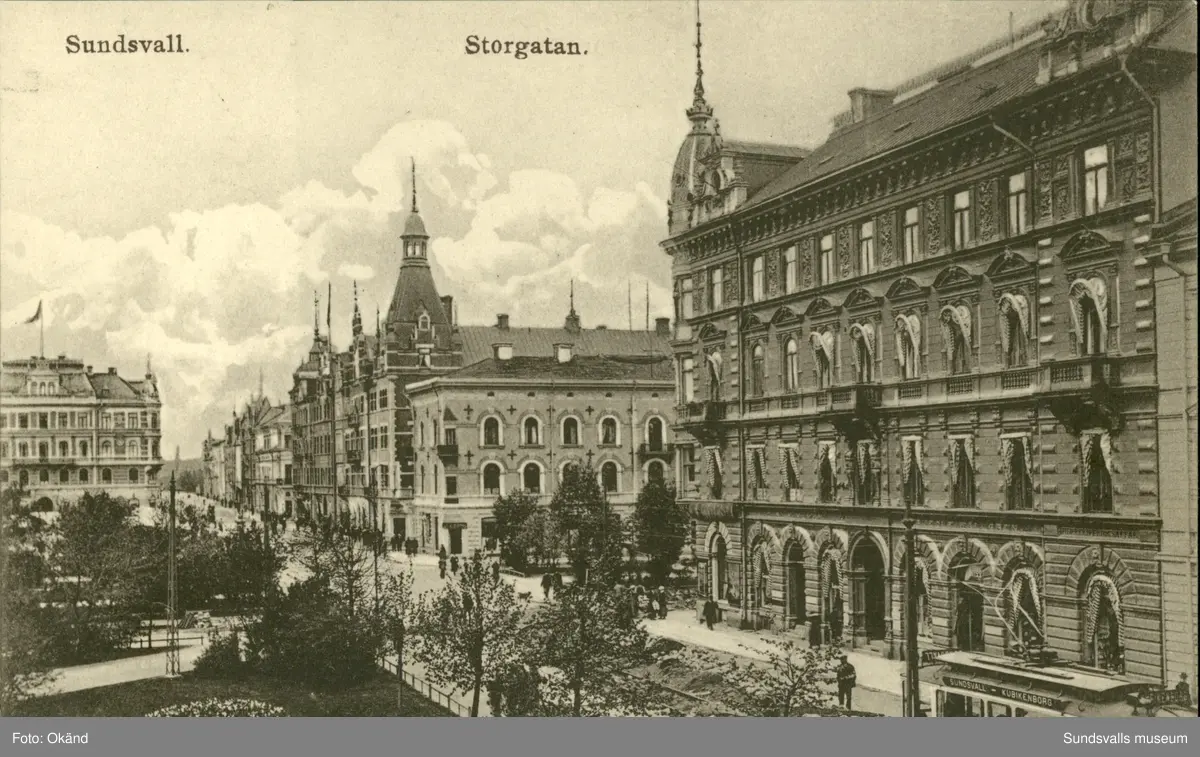Vykort med motiv över Storgatan i Sundsvall.