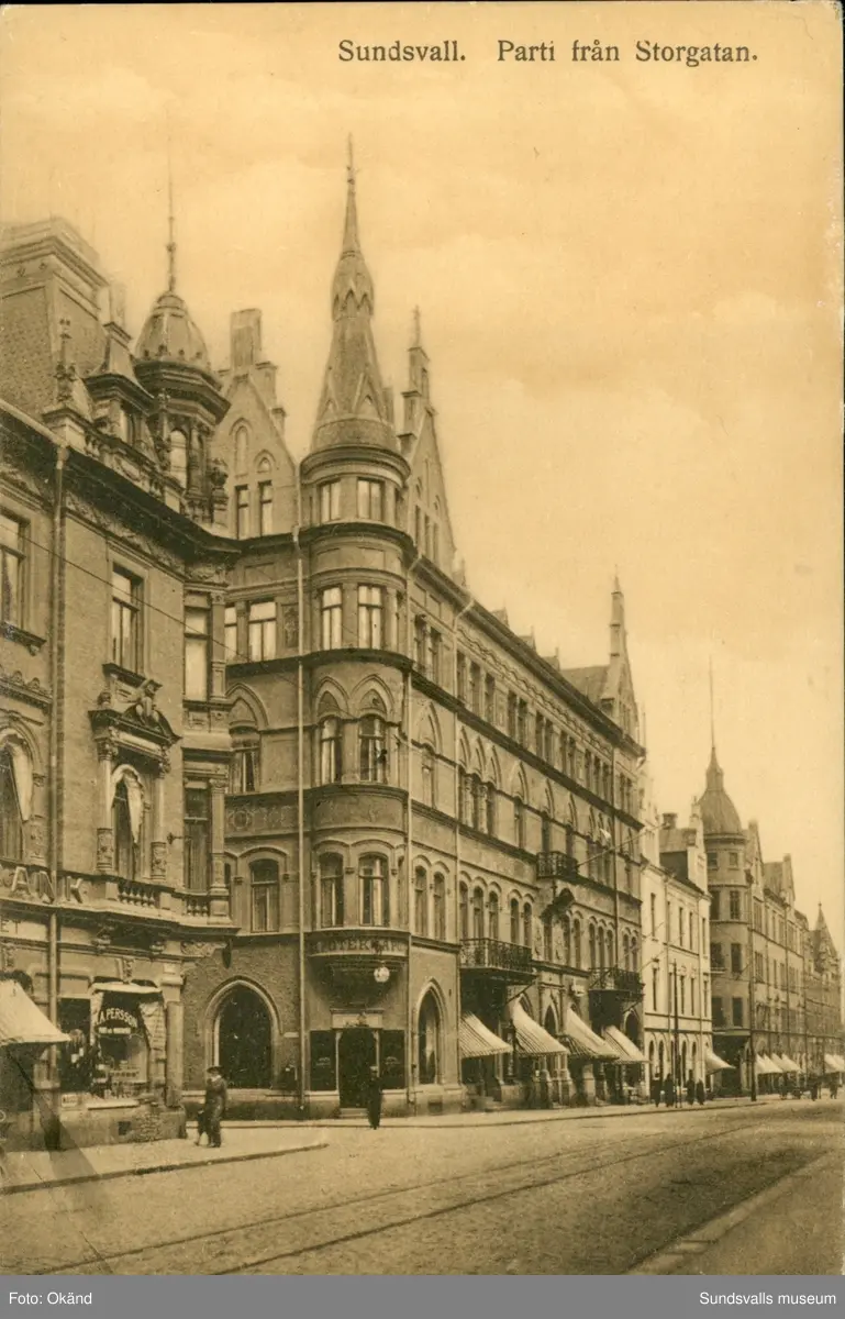 Vykort med motiv över parti av Storgatan i Sundsvall.