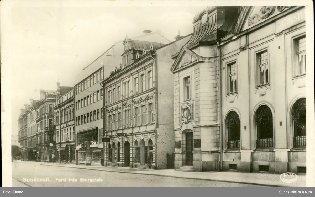 Vykort med motiv över parti av Storgatan i Sundsvall.