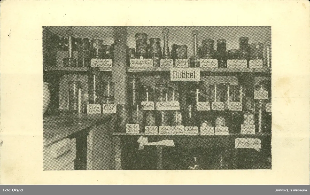 Vykort med motiv av ett skafferi innehållande konserverade varor. Med text på baksidan: Den av eder köpta konserveringssatsen avgår idag pr post vilket vi härmed vill underrätta eder. Vi rekomenderar oss och tecknar Högaktningsfullt Norrlandsdepoten, Sundsvall.