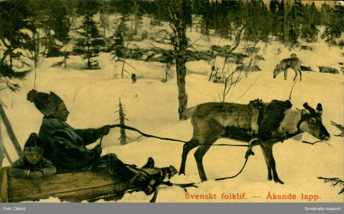 Vykort med vintermotiv av betande renar och ett par samer i kälke.
