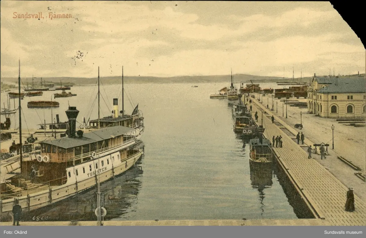 Vykort med motiv över hamnen i Sundsvall med bland annat passagerarbåten Turisten i förgrunden.