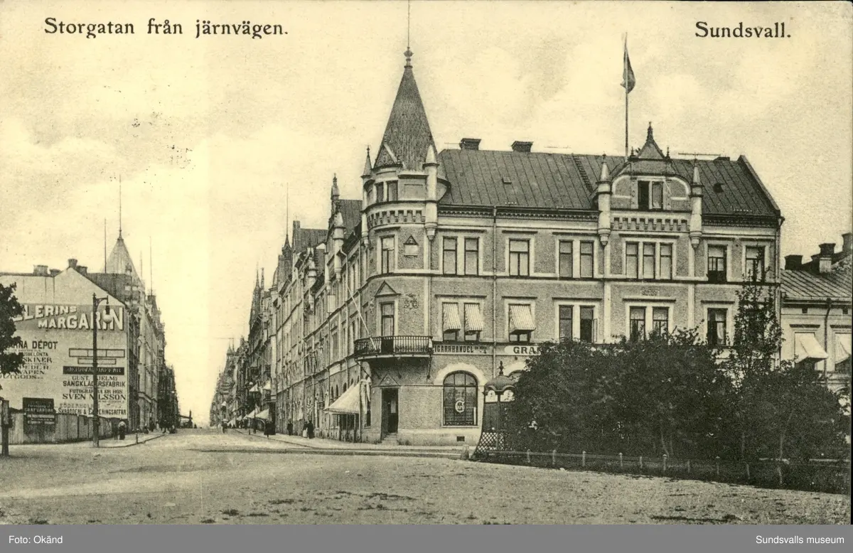 Vykort med motiv över Storgatan sett från järnvägen i Sundsvall.