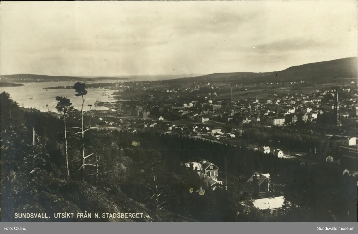 Vykort med motiv över Sundsvall med utsikt från Norra stadsberget.