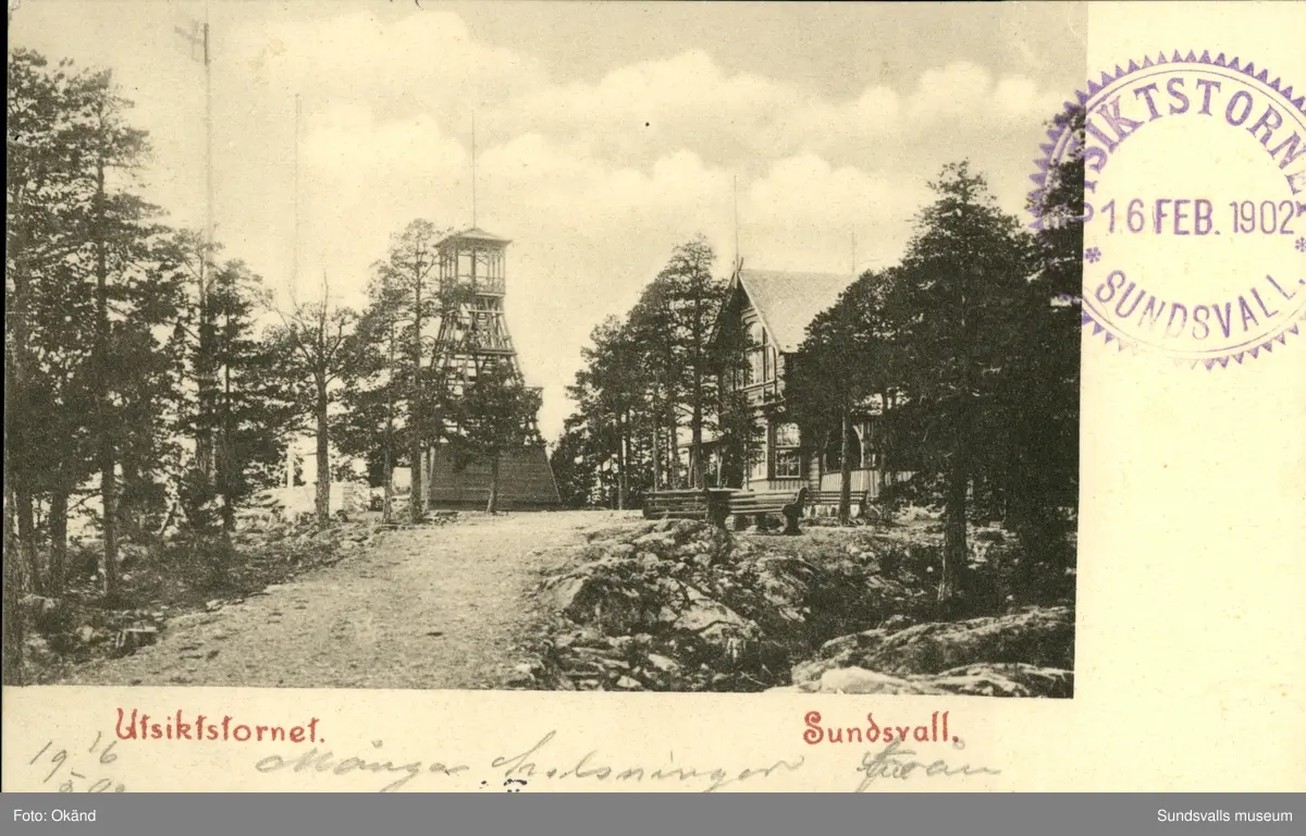 Vykort med motiv över Utsiktstornet och Turistpaviljongen i Sundsvall.