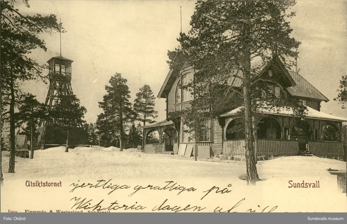 Vykort med motiv över Turistpaviljongen och Utsiktstornet i Sundsvall.