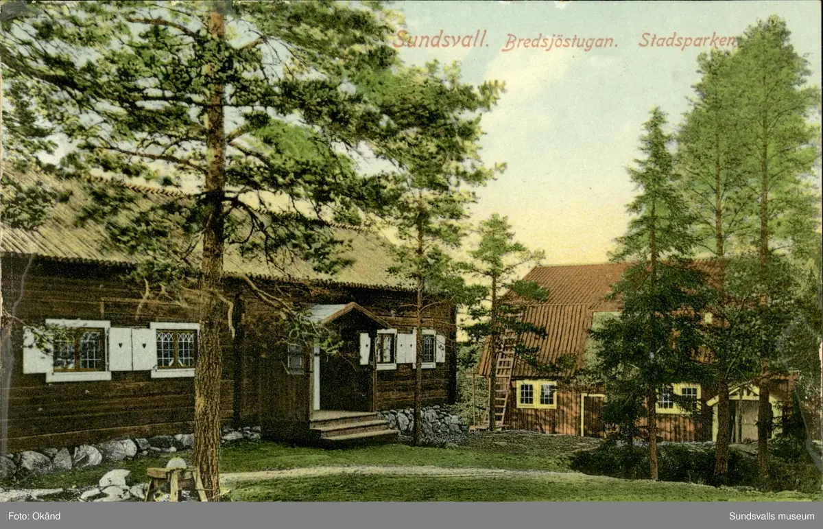 Vykort med motiv över Bredsjöstugan på Norra Stadsberget i Sundsvall.
