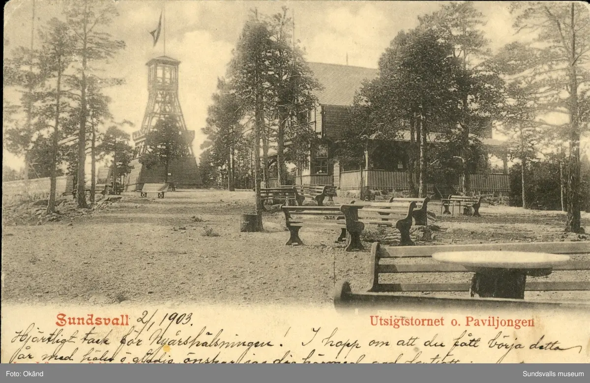 Vykort med motiv över Turistpaviljongen och Utsikstornet i Sundsvall.