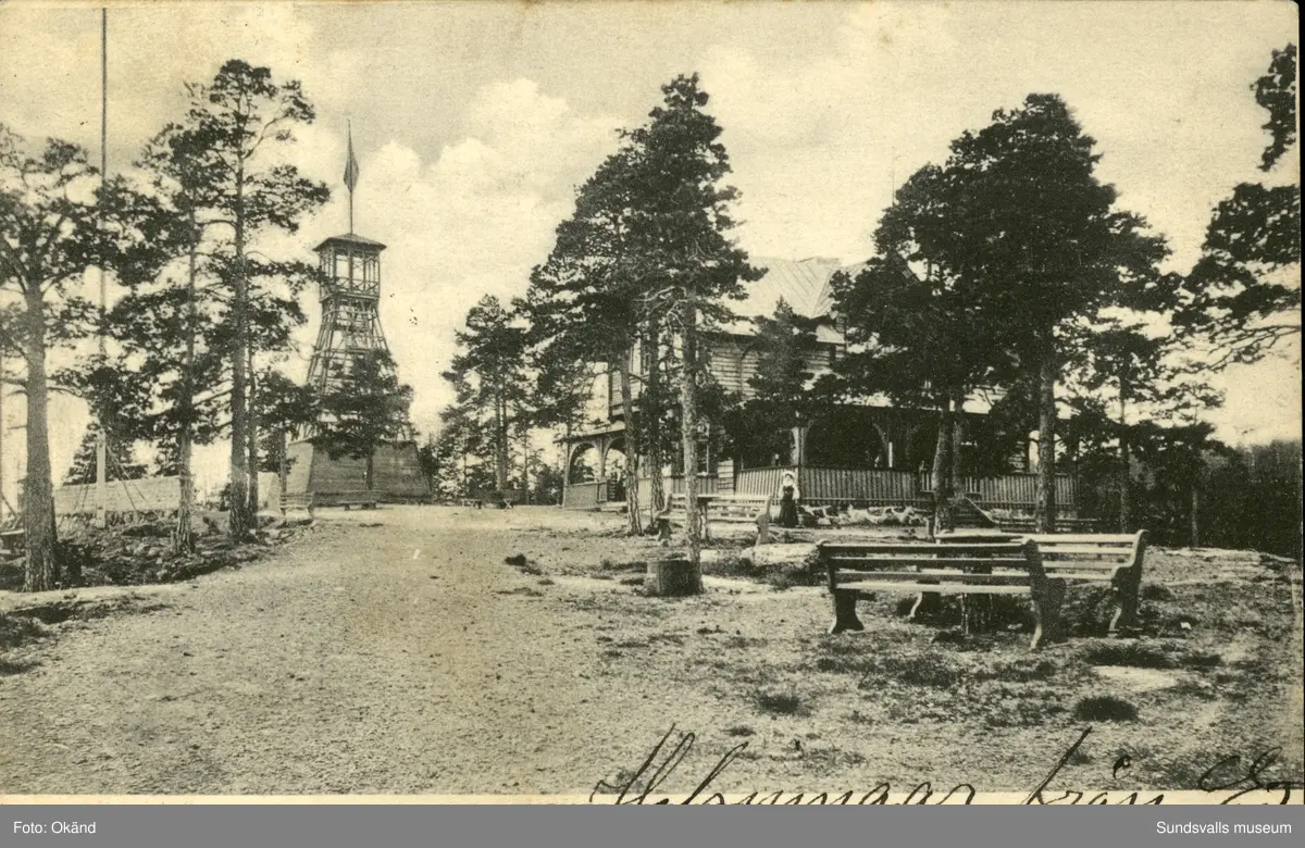 Vykort med motiv över Turistpaviljongen och Utsiktstornet i Sundsvall.