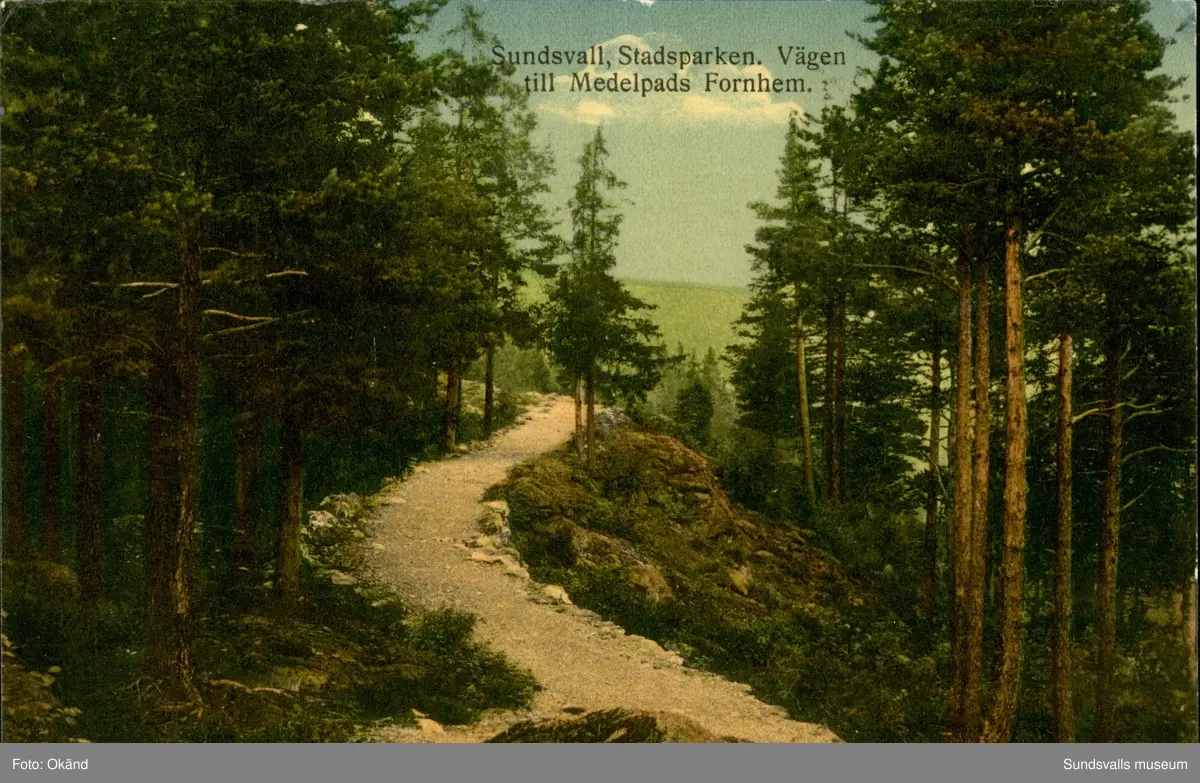 Vykort med motiv över vägen till Medelpads fornhem på Norra Stadsberget i Sundsvall.