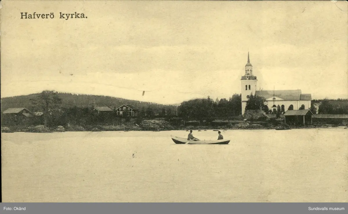 Vykort med motiv över två stycken fiskare i en båt och kyrkan i Haverö.