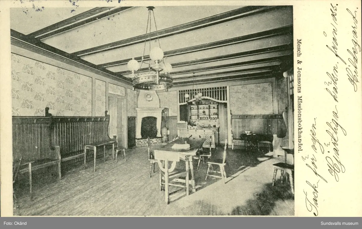 Vykort med motiv över interiören i Turistpaviljongen i Sundsvall.