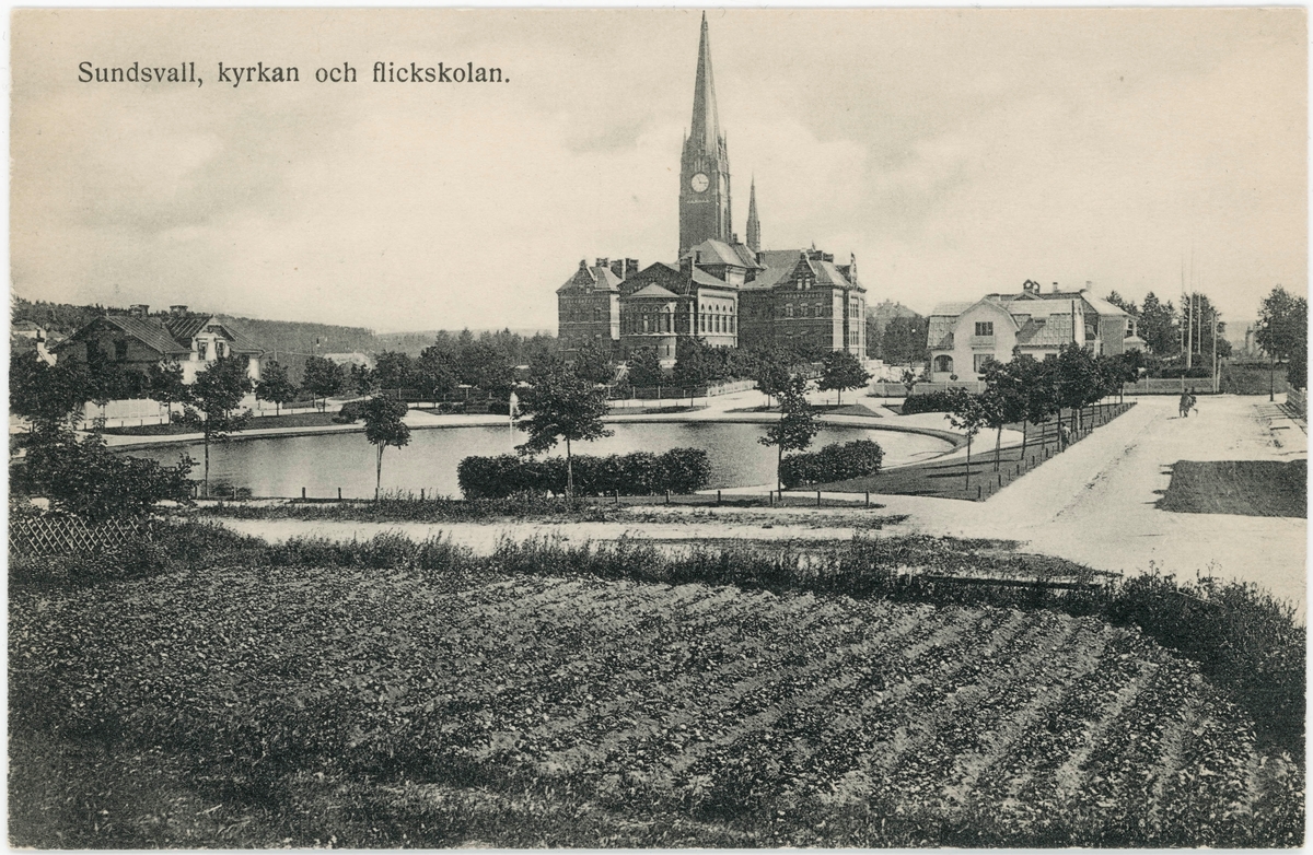 Vy med Bünsowska tjärn och odlingar i förgrunden. I bakgrunden Gustav Adolfskyrkan samt Flickskolan. Text på vykortet "Sundsvall, Kyrkan och Flickskolan".