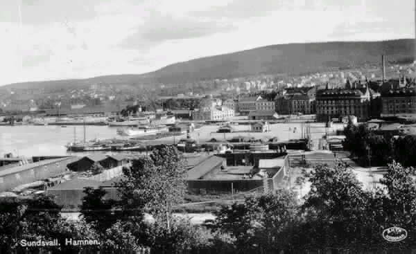 Norra kajen med magasin i bildens förgrund, därefter Selångersån, Tivolibron och Finnkajen. I bildens mitt Tullpackhuset och tullpaviljonger. Bildens bakgrund är Östermalm och Skönsmon. Vid hamnen finns en segelbåt, motorbåtar och ett par passagerarbåtar. Text på vykortet "Sundsvall. Hamnen."