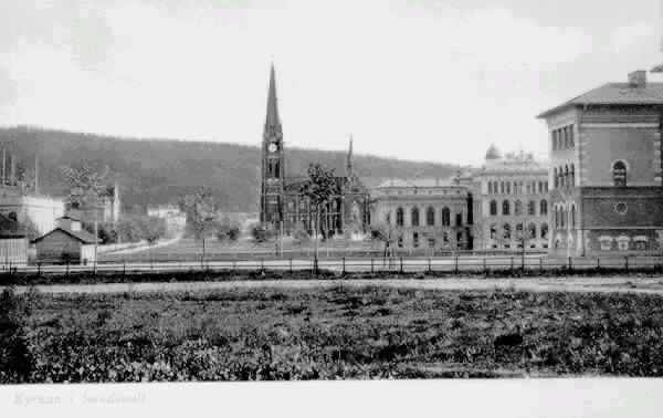 Från höger folkskolan/Gustav Adolfsskolan, läroverket/Hedbergska skolan, Gustav Adolfskyrkan. Text på vykortet "Kyrkan i Sundsvall."