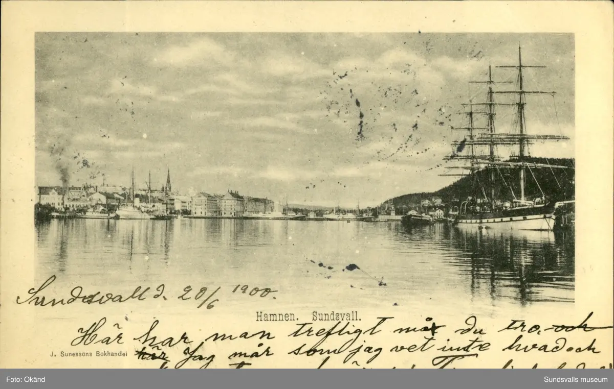 Vykort med motiv över hamnen i Sundsvall.