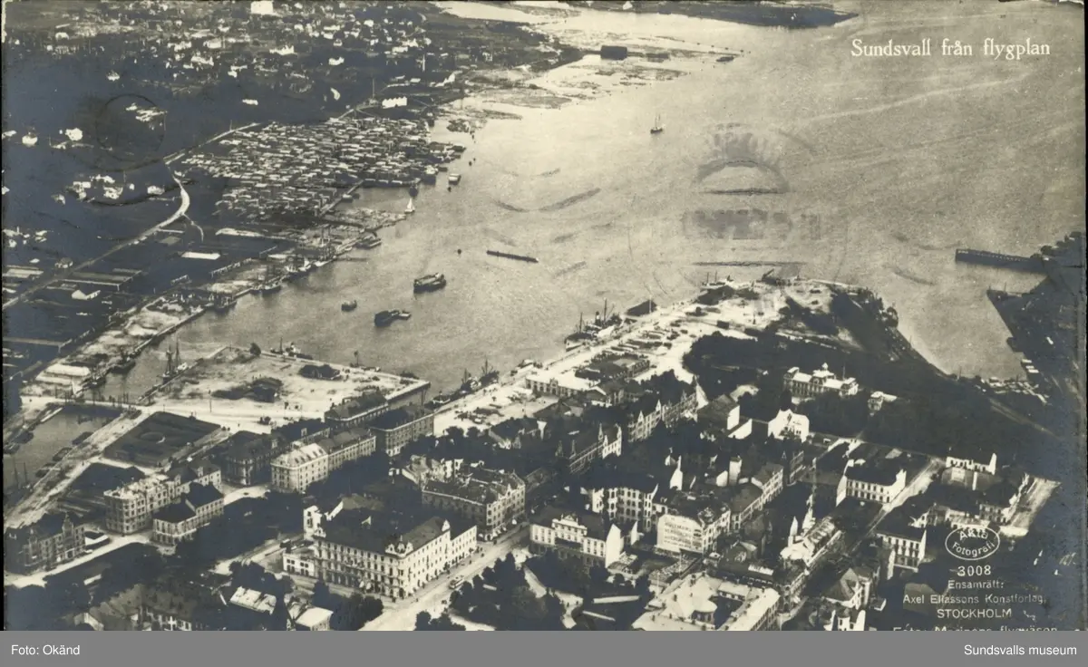 Vykort med flygmotiv över hamnen i Sundsvall.