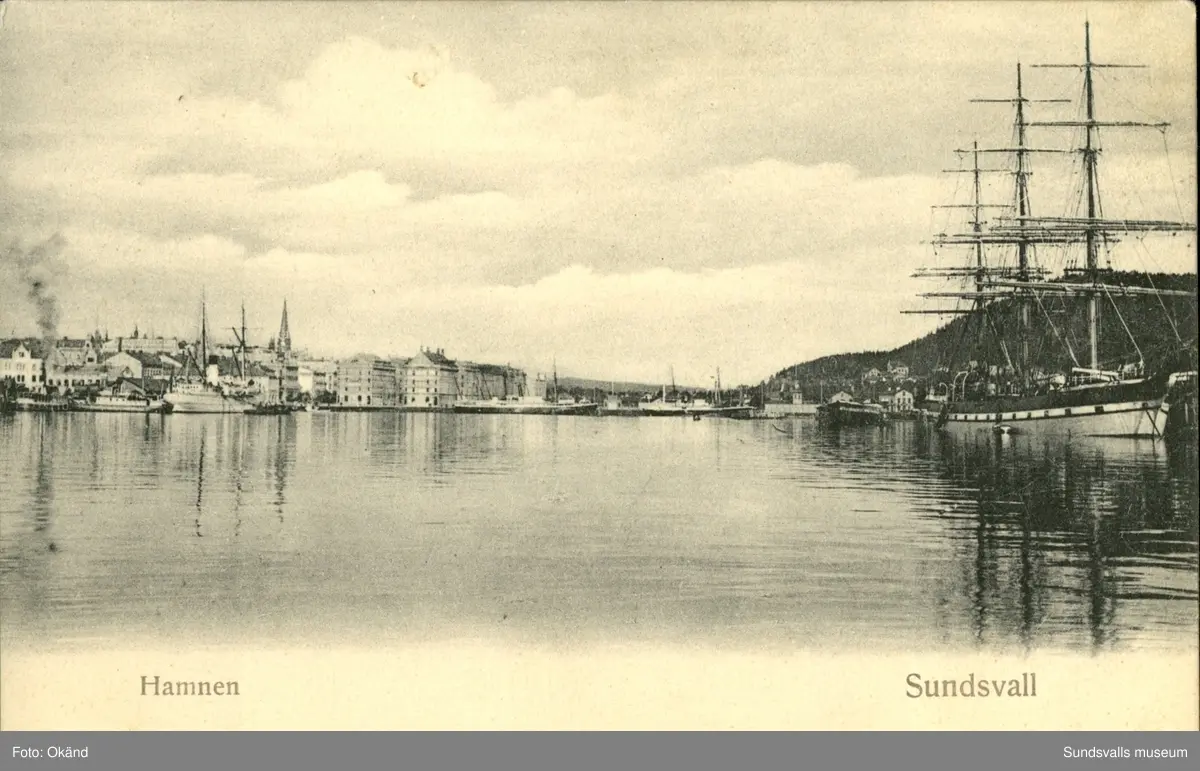Titel: Vykort med motiv över hamnen i Sundsvall.
