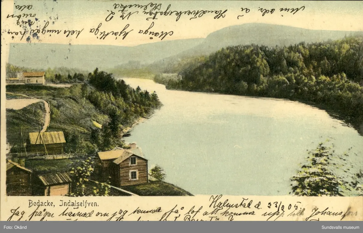 Vykort med motiv över Indalsälven vid Bodackestrand.