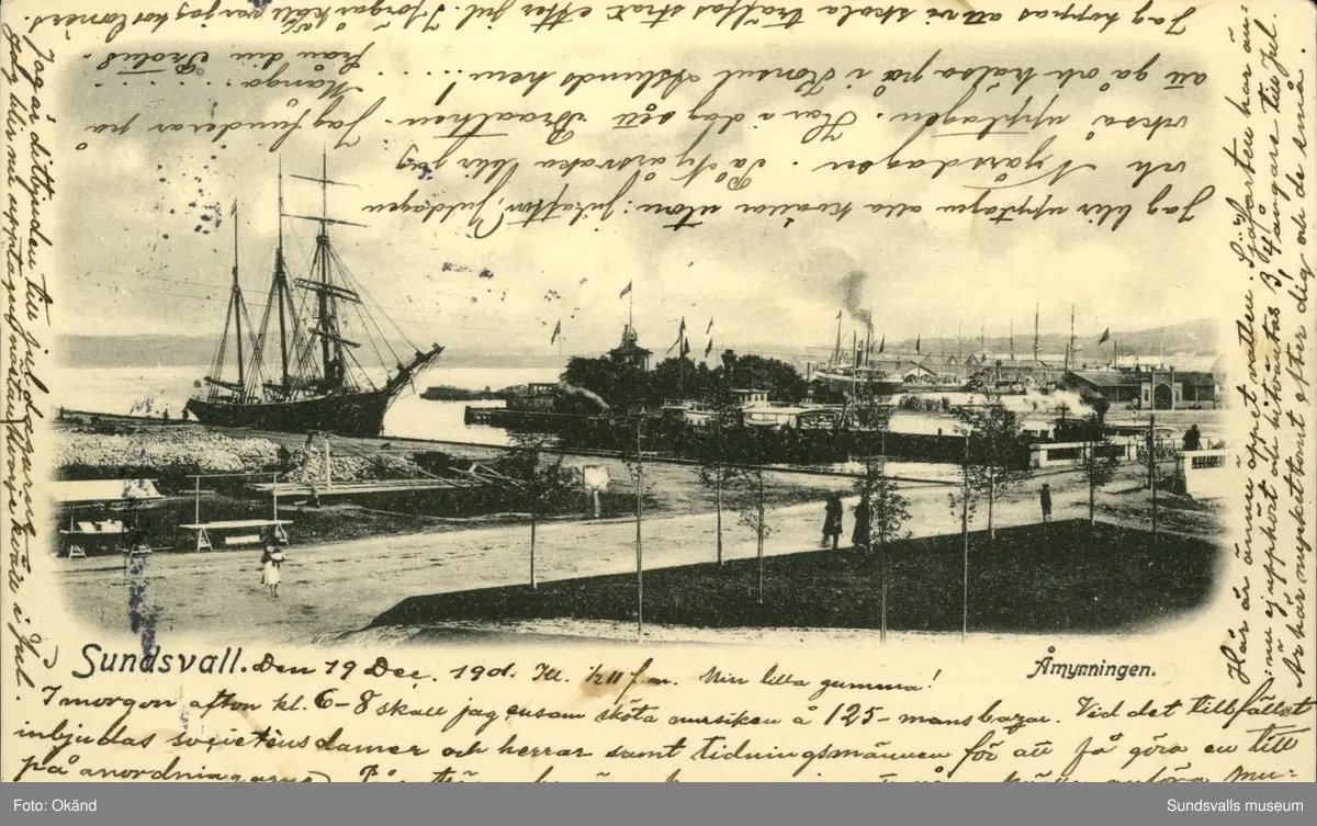 Vykort med motiv över hamnen och åmynningen i Sundsvall.