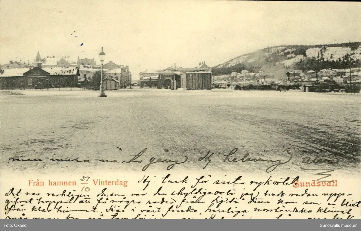 Vykort med vintermotiv över hamnen i Sundsvall.
