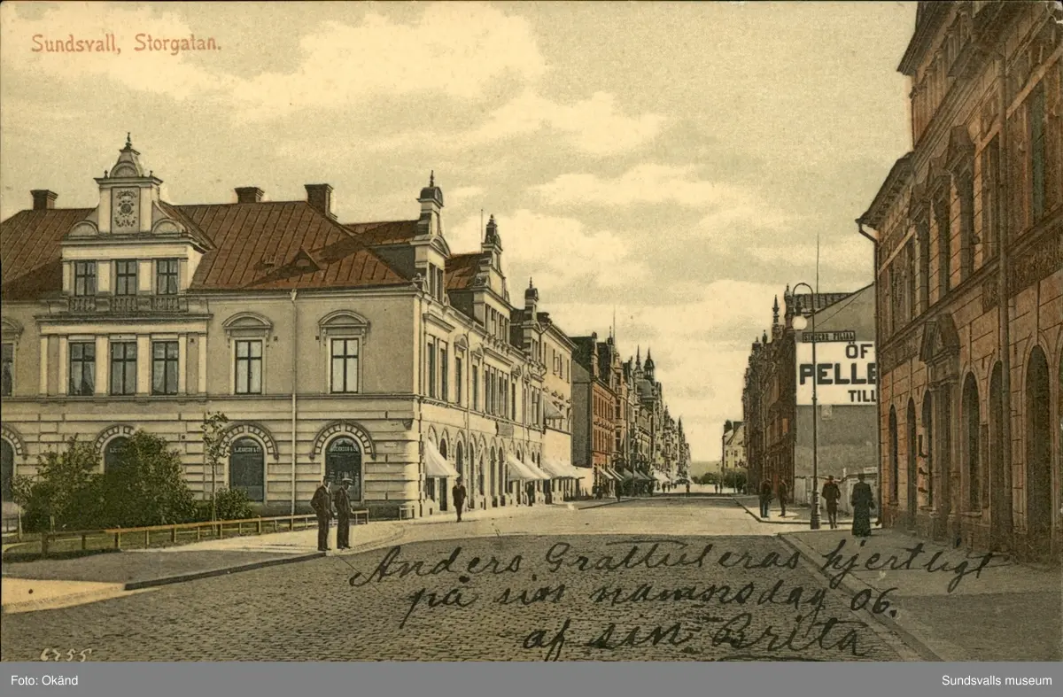 Vykort med motiv över Storgatan i Sundsvall.