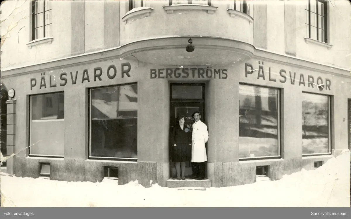 Vykort med motiv över Bergströms Pälsvaror i Sundsvall.