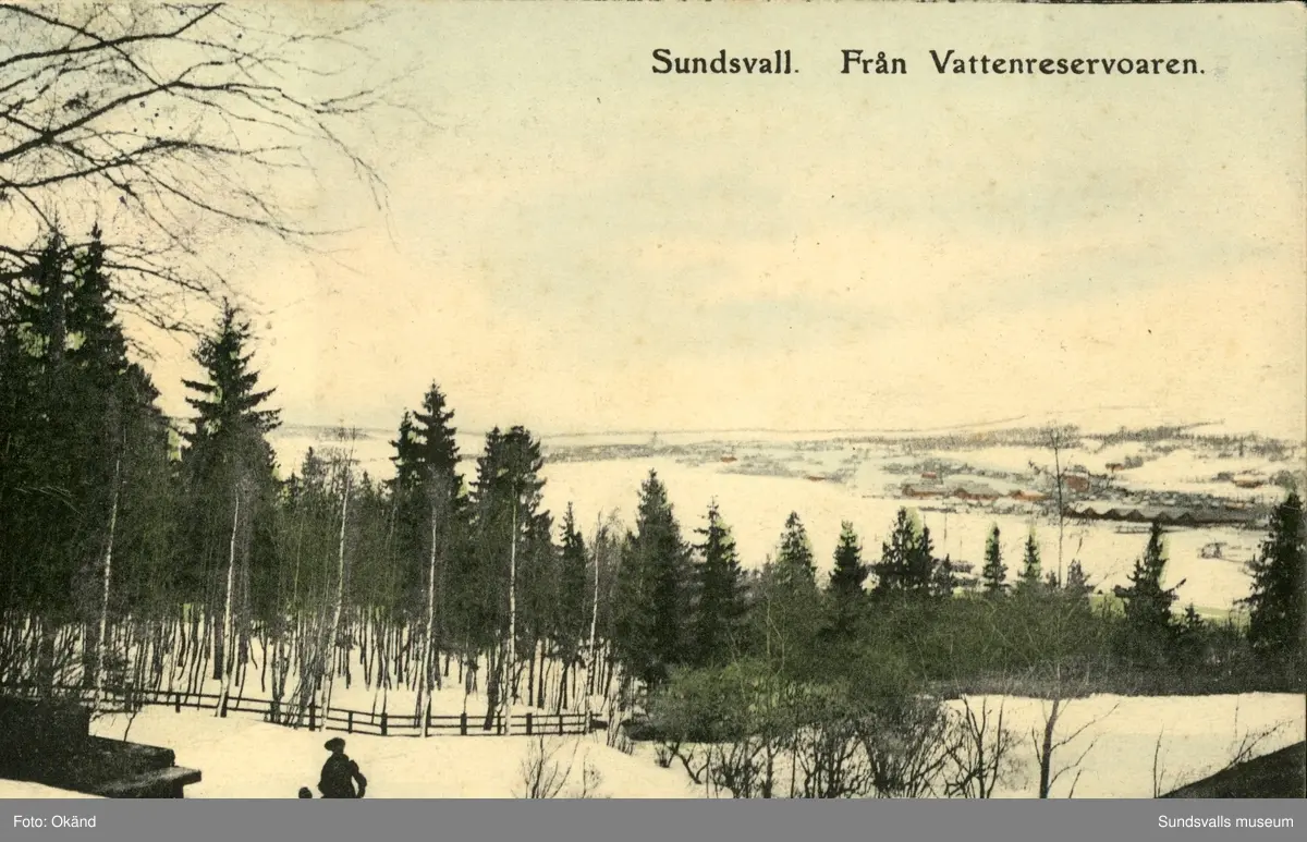 Vykort med motiv över Sundsvall från vattenreservoaren.