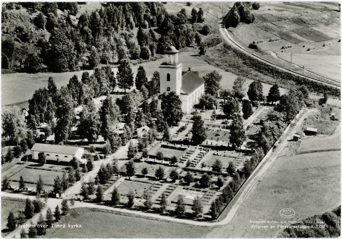 Flygfoto över Timrå kyrka med kyrkogård. Vykort.
