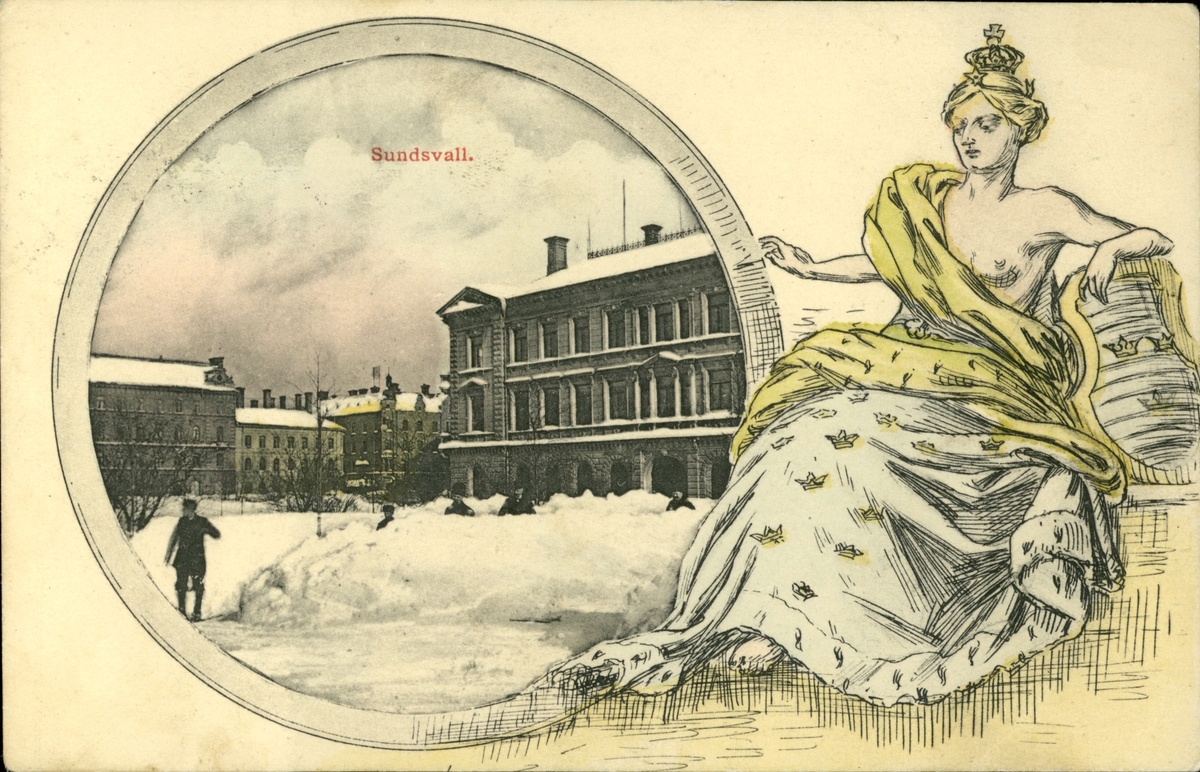 Vykort med motiv av en sittande kvinna och en infälld vinterbild från Sundsvall.
