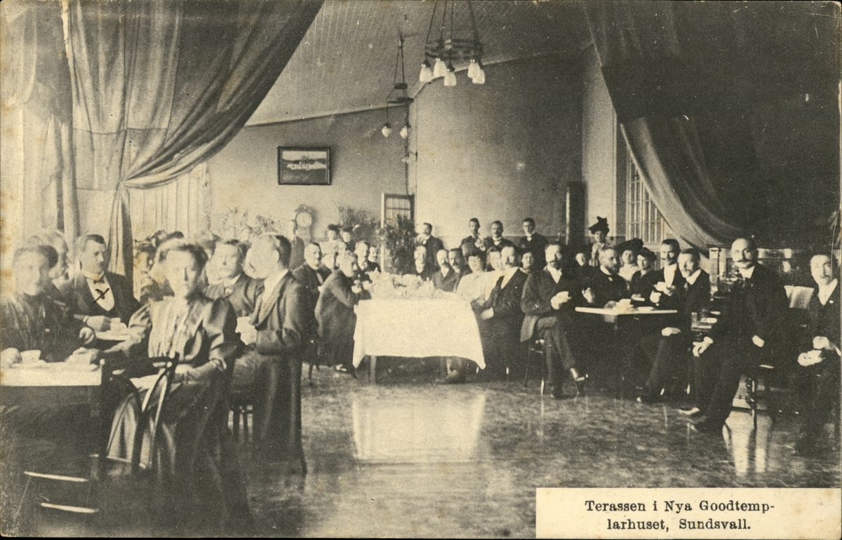 Vykort med motiv över terassen i Nya Godtemplarhuset i Sundsvall.