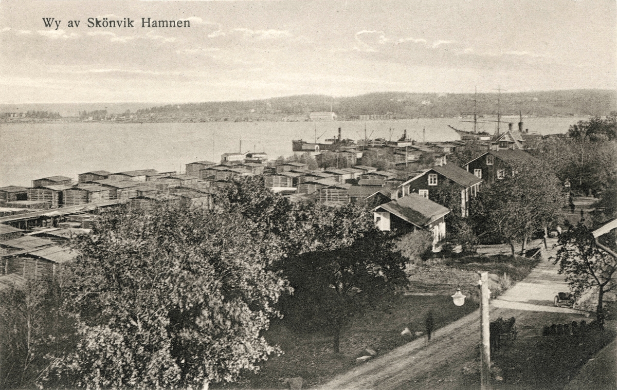 Vy av Skönviks samhälle och brädgård. Hamnen med segelfartyg. Vykort.
