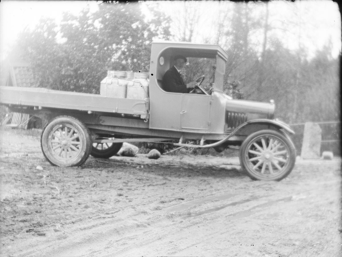 Man kör lastbil lastad med mjölkkannor, Börstil, Uppland