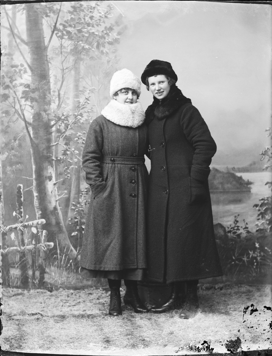 Ateljéporträtt - två kvinnor klädda i ytterkläder, Östhammar, Uppland