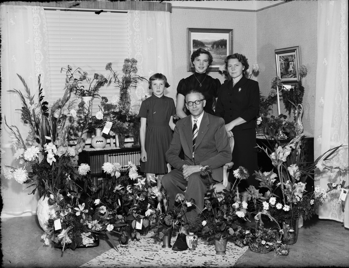 Familj omgiven av blommor i bostadsmiljö, Östhammar, Uppland