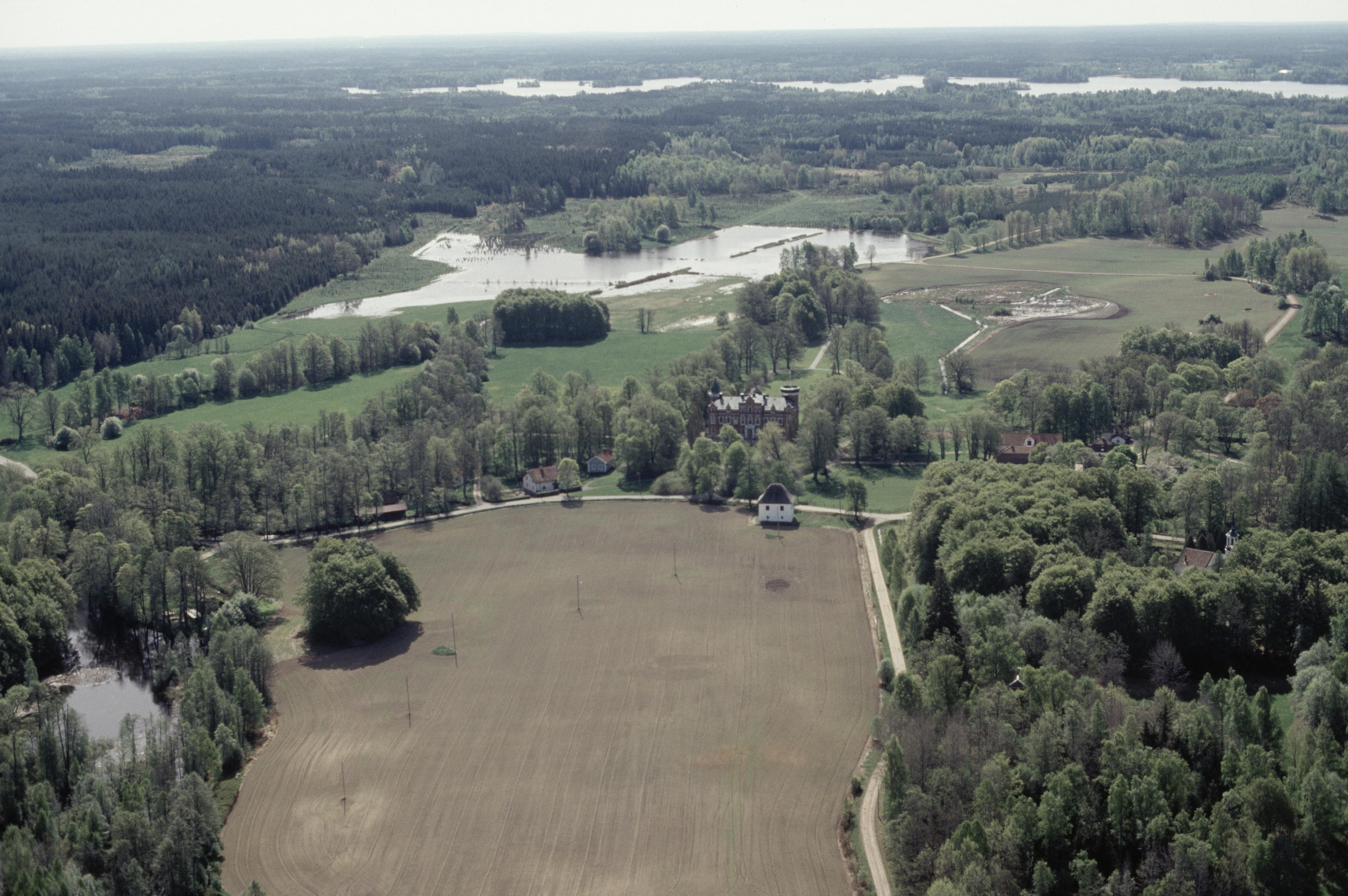 Boo fideikommiss / Boo slott RAÄnr Bo 51:1 vid Bosån. Fatbursbyggnad vid bildens mitt. Bilden är tagen mot (väderstreck): SO